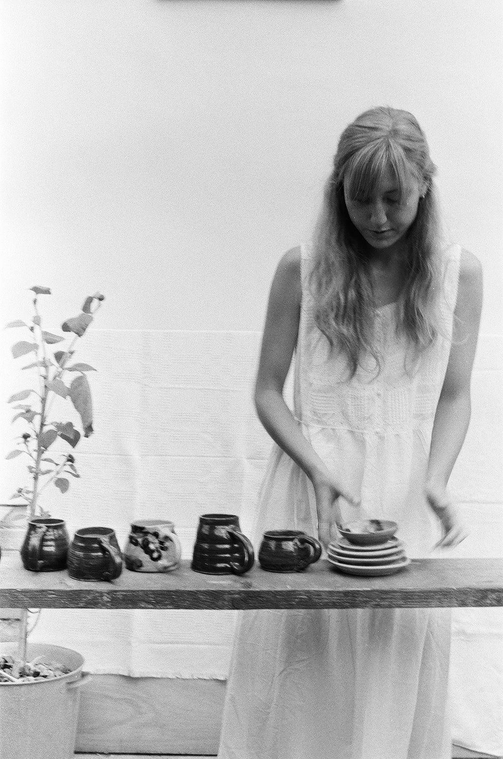 She makes functional wares such as mugs, plates and vases using warm-toned stoneware clay.